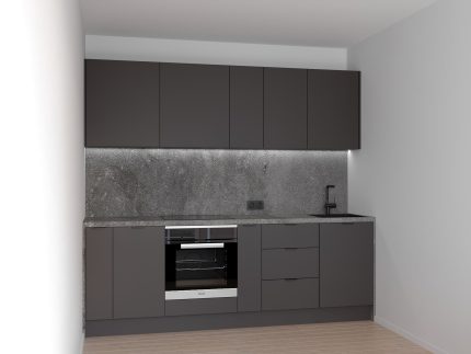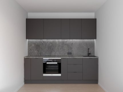 Virtuve izgatavota no augstvērtīgiem mēbeļu korpusiem, Niemann materiālu fasādēm, BLUM furnitūras, Furnipart dizaina rokturiem, EGGER galda virsmas.